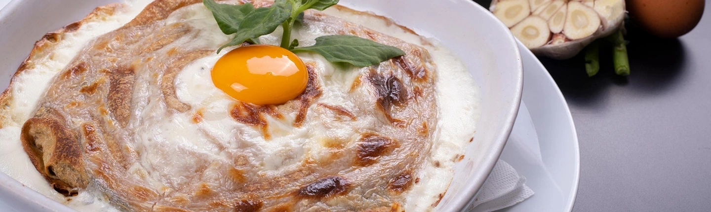 ALHEIRA GAME SAUSAGE (Traditional Portuguese meat and bread sausage), EGG YOLK, CHEESE, SPINACH AND CREAM