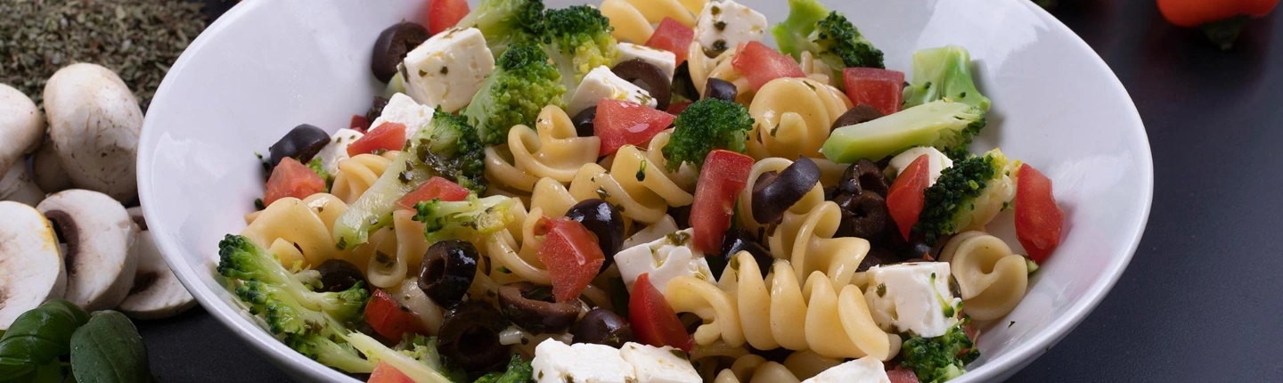 massa, brócolos, tomate, queijo feta, ovo e azeitonas pretas com azeite de manjericão